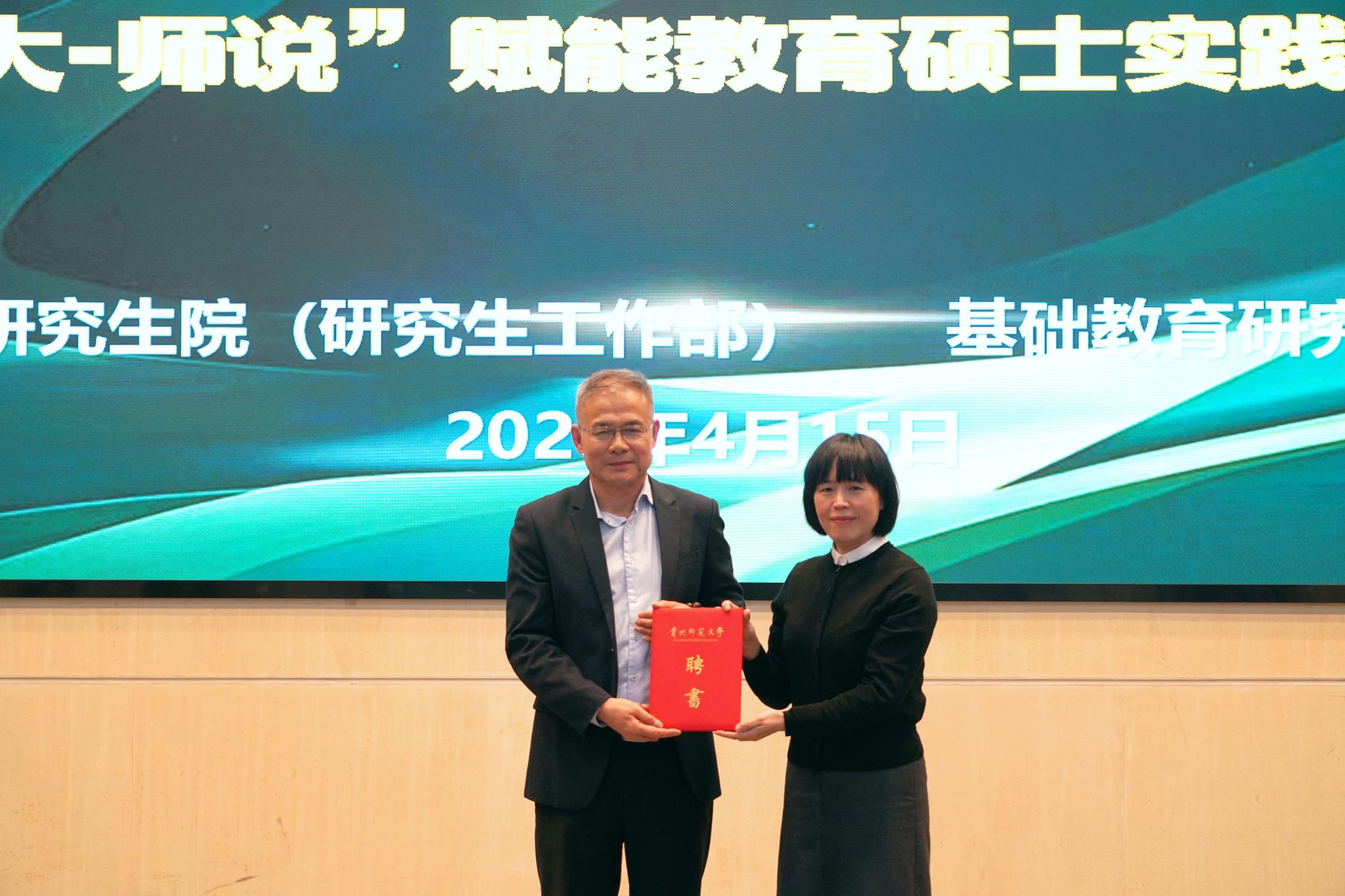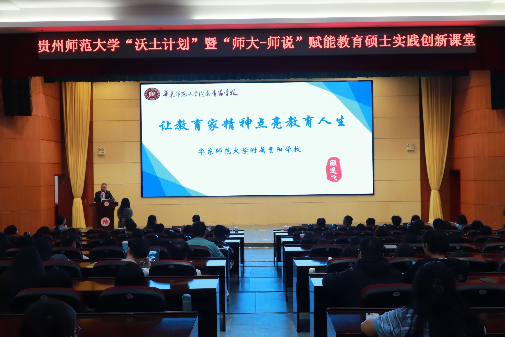 4月15日,贵州师范大学“沃土计划”暨“师大—师说”赋能教育硕士实践创新课堂(第六期)在师大东区会议中心一楼报告厅顺利举办。活动特邀华东师范大学附属贵阳学校校长顾逸飞作“让教育家精神点亮教育人生”专题讲座。副校长刘瑾、研究生院(研究生工作部)及基础教育研究院领导老师、教育硕士研究生代表共同参加。